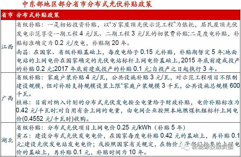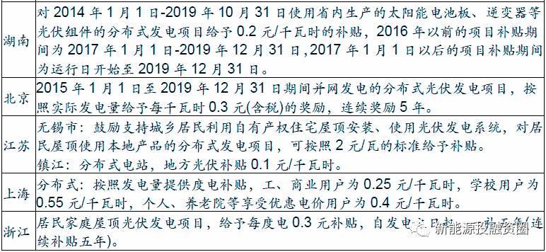 各省級(jí)、地方政府提供額外補(bǔ)貼,進(jìn)一步促進(jìn)分布式發(fā)展。為鼓勵(lì)分布式電站發(fā)展,各級(jí)地方政府,尤其中東部地區(qū)政府通過(guò)提供度電補(bǔ)貼、系統(tǒng)裝機(jī)補(bǔ)貼以及上網(wǎng)電價(jià)補(bǔ)貼等多種補(bǔ)貼鼓勵(lì)當(dāng)?shù)胤植际桨l(fā)展。部分地方政府按照發(fā)電量在國(guó)家統(tǒng)一度電補(bǔ)貼和上網(wǎng)標(biāo)桿電價(jià)基礎(chǔ)上提供0.1/kWh~0.4元/kWh的度電補(bǔ)貼或者額外上網(wǎng)電價(jià)補(bǔ)貼,或按照系統(tǒng)裝機(jī)規(guī)模提供設(shè)備補(bǔ)貼(最高補(bǔ)貼金額可達(dá)到4元/W)。