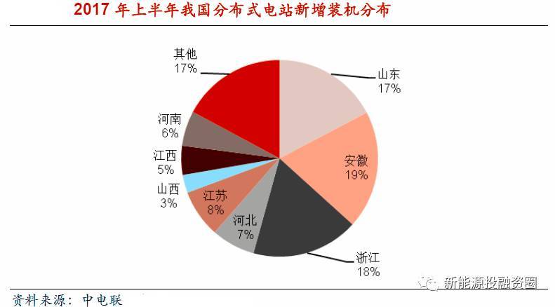2017年上半年,我國(guó)分布式光伏新增裝機(jī)達(dá)到7.1GW,超過(guò)去年全年裝機(jī)(4.3GW)將近65%,其中山東、安徽、浙江三省分布式新增裝機(jī)3.9GW,占全國(guó)分布式電站新增裝機(jī)比重超過(guò)50%。