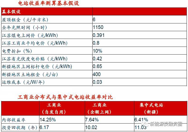 我們按照分布式電站6.5元/W系統(tǒng)成本、集中式電站成本7元/W系統(tǒng)成本,分別測(cè)算一個(gè)位于江蘇5MW裝機(jī)的工商業(yè)分布式電站與一個(gè)位于新疆50MW裝機(jī)的集中式電站收益率。對(duì)于工商業(yè)分布式電站,我們分別考慮“自發(fā)自用、余電上網(wǎng)”模式以及“全額上網(wǎng)模式”,測(cè)算結(jié)果顯示工商業(yè)分布式電站收益率高于集中式電站收益率水平。