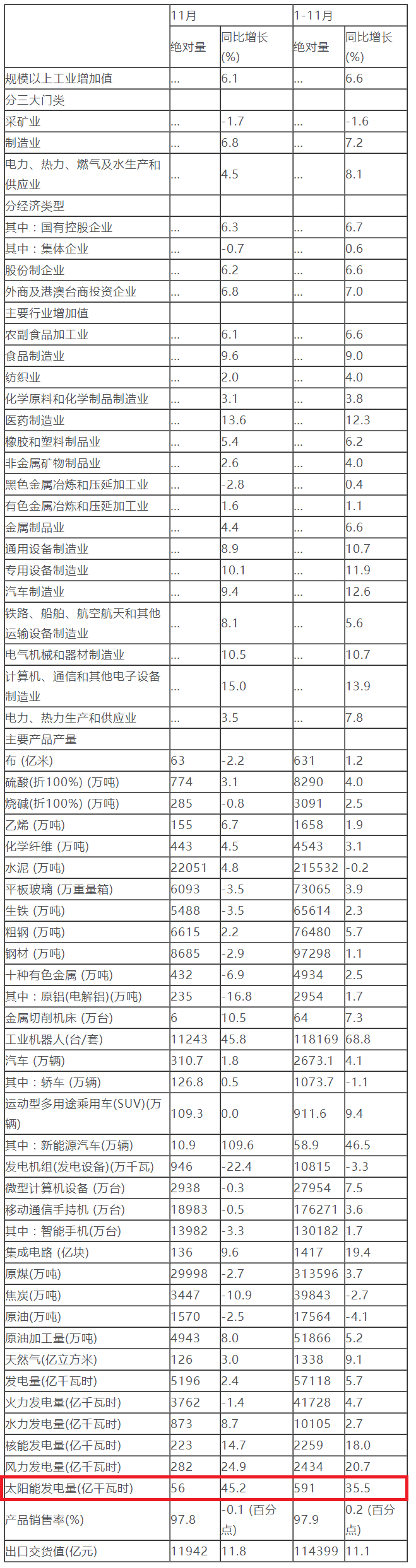 其中,11月,我國太陽能發(fā)電量56億千瓦時(shí),同比增長45.2%。1-11月太陽能發(fā)電量591億千瓦時(shí),同比增長35.5%。
