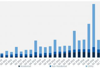 報告顯示,公共事業(yè)板塊中領(lǐng)先的是內(nèi)華達州、北卡羅來納州和德克薩斯州。其中,德克薩斯州2017年第三季度光伏裝機量比2015全年所有太陽能裝機量還多。美國東南地區(qū)光伏市場剛剛起步,佛羅里達州、密西西比州、南卡羅來納州都實現(xiàn)強勁增長,且預(yù)期2017年光伏裝機量將高于此前多有年份。根據(jù)SEIA,當前全美處于建設(shè)當中的公共事業(yè)規(guī)模光伏項目有4GW,GTM Research預(yù)測到年末還將增加3.9 GW。這樣一來,2017年將成為美國光伏裝機量第二大的年份,僅次于2016年。