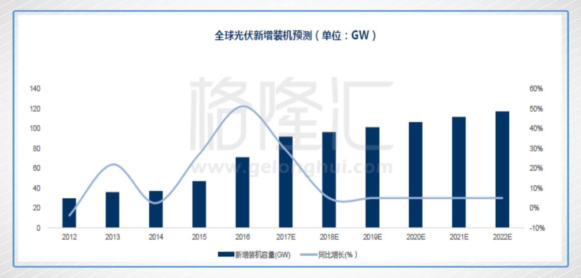 由于光伏過去遠超計劃的裝機量,2018年到2022年全球光伏市場需求同比增長將實現階段性平穩(wěn),預計2017年全球光伏新增裝機92GW,同比增長29.22%。2018年新增裝機穩(wěn)定增長,年均增長率將回落到5%~6%。