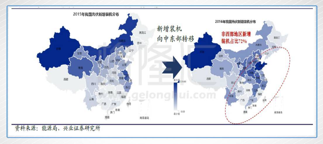 再從新增裝機布局看,由西北地區(qū)向中東部地區(qū)轉移的趨勢更加明顯。華東地區(qū)新增裝機為825萬千瓦,同比增加1.5倍,占全國的34%。華中地區(qū)新增裝機為423萬千瓦,同比增長37%,占全國的17.3%。西北地區(qū)新增裝機為416萬千瓦,同比下降50%。分布式光伏發(fā)展繼續(xù)提速,上半年浙江、山東、安徽三省新增裝機均超過100萬千瓦,同比增長均在2倍以上,三省分布式光伏新增裝機占全國的54.2%。