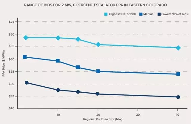 圖1展示了按照項(xiàng)目組合總裝機(jī)的不同,各開發(fā)商對(duì)科羅拉多州東部一個(gè)2兆瓦項(xiàng)目的購電協(xié)議報(bào)價(jià)分布。