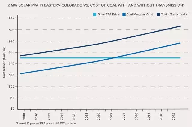 圖3:科羅拉多州東部2兆瓦太陽能項(xiàng)目購電協(xié)議 vs. 包含/不包含輸電成本的煤電發(fā)電成本