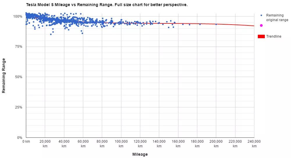 特斯拉什么水平?去年11月,荷蘭比利時(shí)特斯拉論壇收集了全球各地286位Model S車(chē)主提交的電池充放電數(shù)據(jù)。這些實(shí)際運(yùn)行的數(shù)據(jù)可能比特斯拉官方數(shù)據(jù)可信度還高。數(shù)據(jù)顯示,在行駛10萬(wàn)英里后,大多數(shù)Model S的電池組容量將衰減至出廠原始容量的95%;在行駛20萬(wàn)英里(約32萬(wàn)公里)后,電池組容量將衰減至出廠原始容量的90%。