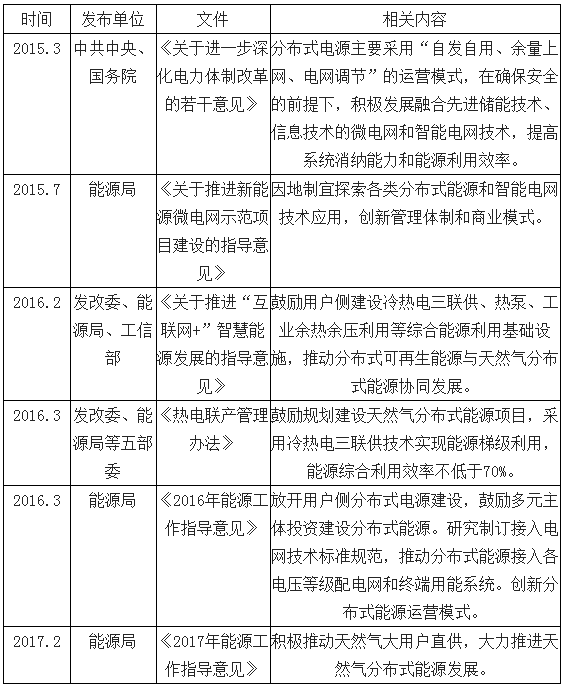 從2015年開始,隨著天然氣價(jià)格改革推進(jìn)、技術(shù)條件趨于成熟、環(huán)保節(jié)能議題愈發(fā)重要,國(guó)家開始集中出臺(tái)政策,大力推動(dòng)分布式能源的發(fā)展。“十三五”規(guī)劃支持天然氣分布式能源發(fā)展,鼓勵(lì)發(fā)展天然氣調(diào)峰發(fā)電和冷熱電三聯(lián)供。