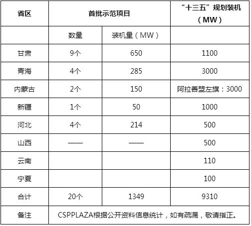 據(jù)CSPPLAZA統(tǒng)計,甘肅、青海、新疆等八省區(qū)已發(fā)布光熱十三五規(guī)劃的總裝機(jī)規(guī)模高達(dá)9.31GW,其中首批20個光熱示范項(xiàng)目的所在地內(nèi)蒙古、青海、甘肅、新疆、河北五省區(qū)到2020年規(guī)劃的光熱裝機(jī)規(guī)模位居全國前五位。