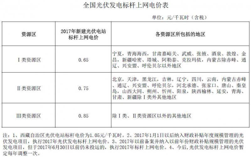 2017年全國光伏標桿上網(wǎng)電價表:分布式光伏電價保持0.42元不變。