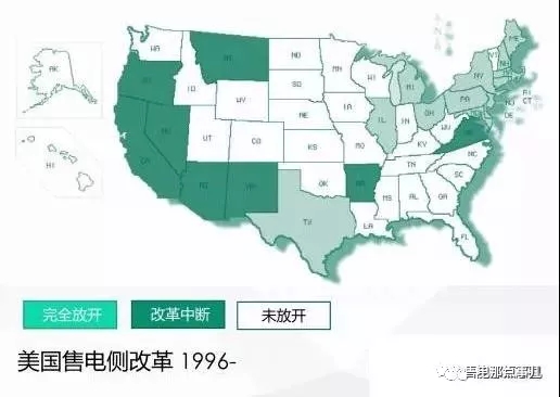 美國作為經濟自由化的國家,在1996年就開始了售電側改革,但是在2002-2003年時加州出現過一次電力危機,從此以后,西部的大部分省份都停止了售電側改革,一直中斷到現在。所以現在談到美國的售電市場,其實主要是指東部地區(qū)。
