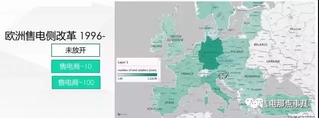 因為歐洲國家整體經歷過一次歐盟改革,所以在歐盟的指令下,除瑞士之外,歐盟所有的國家都進行了售電側改革,至今為止幾乎都完成了售電側改革,但是售電商的數目會存在較大的差異,例如法國的售電商數量在10-20家左右,而德國則超過1000家。