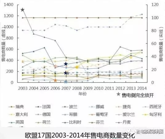 圖中每一根線都代表著一個國家售電側十幾年的歷史反應。例如丹麥,即左上角最上方深灰色五角星的那根線,這根線在2004年突然急劇下降,售電商的數量比2003年減少了一半,這主要是因為2003年的時候丹麥放開了居民側售電市場,同時保持著目錄電價的體系。目錄電價的最高值是期貨市場上下一度電力批發(fā)價格的平均數,加上自由市場上售電商利潤的中位數的溢價。也就是說目錄電價肯定不會比市場上一般售電商的平均水平低,所以這時候大部分的用戶不會轉換到自由市場上,因為他們覺得政府的目錄電價一定是高于平均值的。