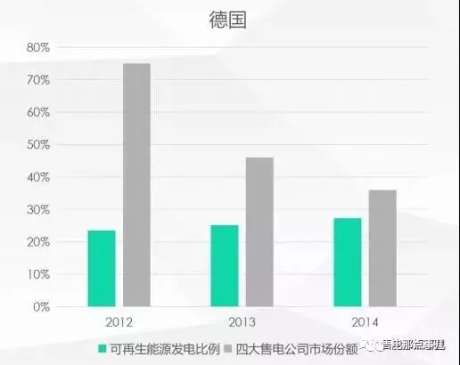 德國分布式能源發(fā)展的比較好。分布式能源其中一個特點是投資比較小,小型的售電公司完全可以承擔,并且有些售電公司非常善于做售電+金融的結合,即售電公司為用戶進行投資,用戶從電費中回收投資,這樣的模式使得小的售電公司有比較穩(wěn)定的現金流和發(fā)電資產,同時跟用戶建立了良好的關系。所以德國在分布式能源發(fā)展比較好的情況下,特別是光伏、風電領域,原來的四大傳統(tǒng)售電公司市場份額有所降低,小型的售電公司開始爭奪用戶側可再生能源的資源以及售電資格。
