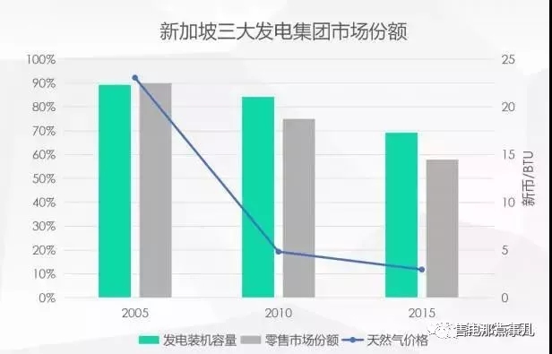2010年左右新加波政府引入了液化天然氣,整個市場上的天然液化氣價格暴跌。不巧的是,所有的傳統(tǒng)售電公司都簽了10-20年的天然氣長協(xié),導致他們在發(fā)電成本上難以降價,新的售電公司就可以通過現貨市場購買液化天然氣,興建一些小型的燃氣電廠,電的價格隨之下降。從圖中可以看到,自從2010年天然氣的價格跳水式的下降之后,傳統(tǒng)發(fā)電集團零售市場的份額在慢慢下降,甚至裝機容量也在慢慢下降。