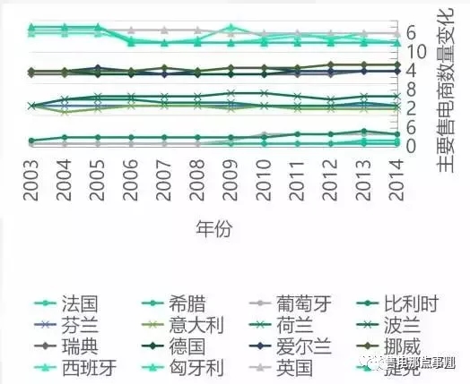 上圖顯示的是歐盟13個國家,2003-2014年售電商數量的變化。從上圖可以看出,大部分國家售電商的數量還是比較平穩(wěn)的。五角星的地方表示售電側從工業(yè)側開放到居民側的時間節(jié)點,可以看到五角星出現的前后數據沒有發(fā)生很大的波動,也就是說,售電公司的數量不會因為工業(yè)側或者居民側的開放而發(fā)生較大的變化,這也就意味著要進入售電市場就要從一開始進入,跟隨市場一起成長。