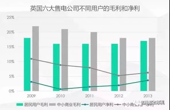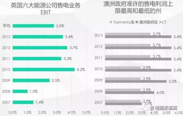 上圖是英國六大能源公司的凈利,以及澳洲政府允許的售電公司的凈利上限。從中可以發(fā)現,雖然英國售電公司的毛利率差不多在25%,但是凈利只有3.7%,澳洲的凈利也差不多在3%-5%之間。