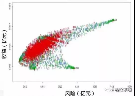 不管是保底還是分成還是保底+分成,其中的比例和價格都有一個最優(yōu)配置策略,這在金融上叫做“有效邊界”,即上圖中左邊魚頭位置的點,資產配置處于最高水平,即相同風險之下,能獲得的收益最大。