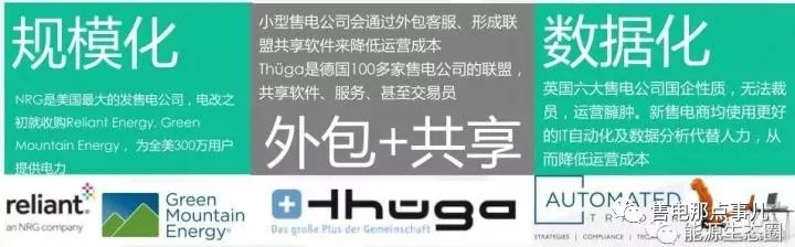 外包+共享:例如德國,很多小型的售電公司抱團形成聯(lián)盟,由聯(lián)盟負責購買軟件、服務,共享交易員等,從而降低運營成本。