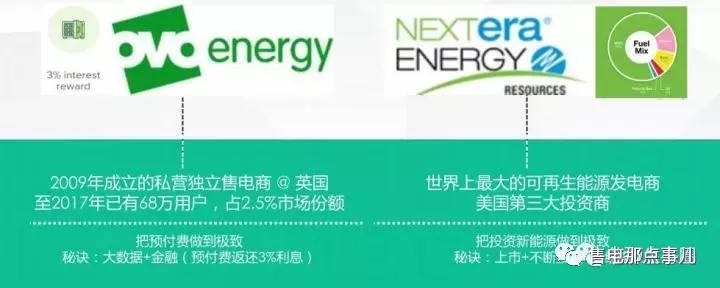 差異化還可以體現在細分市場方面。例如2009年英國成立的私營獨立售電商OVO energy公司,他們把預付費業(yè)務做到了極致。用戶存入預付費買電的同時,公司用預付費的錢做金融,給用戶返還一定的利息。這個模式受到了非常多英國用戶的好評,簡直就是余額寶+電力公司賬單的形式。這家公司2017年已經有68萬用戶,占市場2.5%的份額。