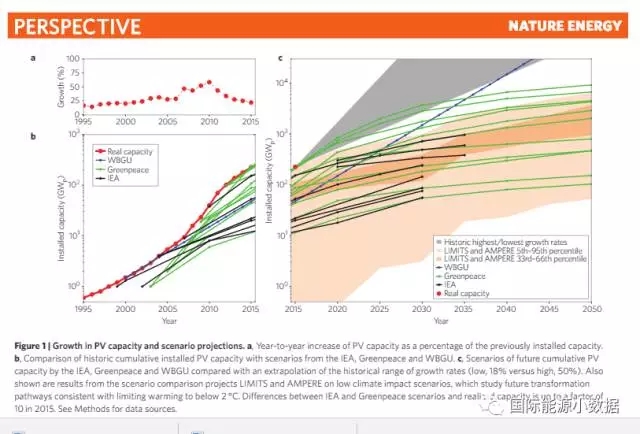 從上圖可見,國際能源署(IEA)(黑色曲線)、德國全球變化委員會(WBGU)(藍色曲線)、綠色和平(Green Peace)(綠色曲線)對于1995-2015年光伏發(fā)展的預(yù)測與光伏的實際發(fā)展軌跡相去甚遠,只有綠色和平近幾年的預(yù)測比較接近現(xiàn)實。那么為什么這些相當嚴謹而又權(quán)威的機構(gòu)對于光伏發(fā)展的模型分析預(yù)測如此不靠譜呢?墨卡托研究所的文章認為主要是以下三個原因: