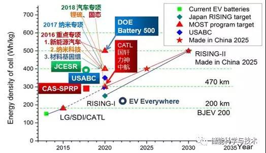 為應(yīng)對新能源汽車越來越急迫的高性能需求,各國都已經(jīng)開始布局高能量密度鋰電池, 如日本政府提出,2020年動力電池電芯能量密度將達(dá)到250 W·h/kg,2030年達(dá)到500 W·h/kg;美國先進(jìn)電池聯(lián)合會(USABC)提出將2020年電芯能量密度由原來的220 W·h/kg提高至350 W·h/kg;中國國務(wù)院發(fā)布的《中國制造2025》中明確提出,2020年中國動力電池單體比能量達(dá)到300 W·h/kg,2025年達(dá)到400 W·h/kg,2030年達(dá)到500 W·h/kg。美國Battery500項(xiàng)目提出,2020年研制出能量密度達(dá)到500 W·h/kg的動力電池樣品。提高電芯能量密度,必然要求兼顧安全性,因此發(fā)展全固態(tài)鋰二次電池技術(shù),具有重要的意義。