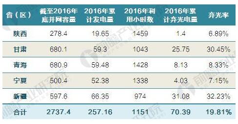 圖表8:2016年西北五省(區(qū))光伏發(fā)電利用及棄光率變化統(tǒng)計(jì)表(單位:萬千瓦,億千瓦時(shí),%,小時(shí),百分點(diǎn))