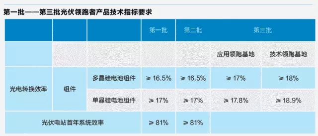 在技術(shù)方面,第三批“光伏領(lǐng)跑者”項(xiàng)目的準(zhǔn)入門檻得到了提升。該期應(yīng)用領(lǐng)跑基地多/單晶硅光伏組件的轉(zhuǎn)換效率要求分別為17%和17.8%,技術(shù)領(lǐng)跑基地多/單晶硅光伏組件的轉(zhuǎn)換效率要求分別為18%和18.9%。