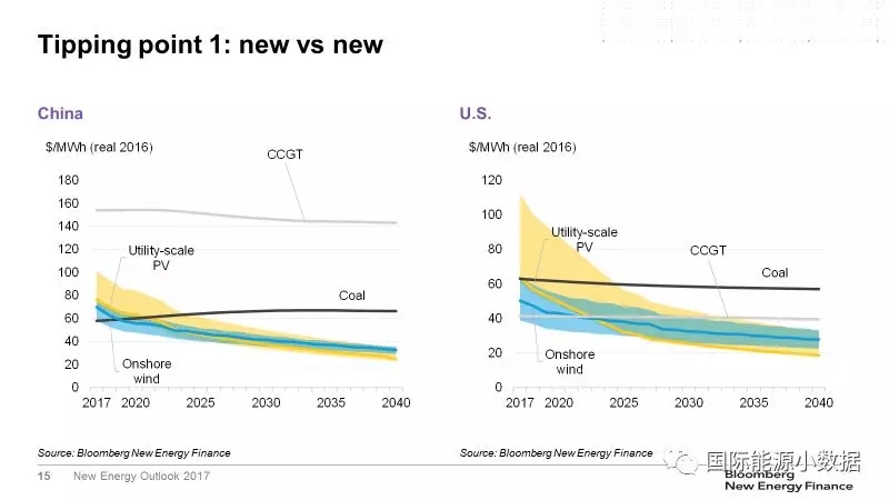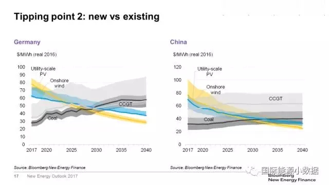 第一個臨界點是:在沒有補貼的情況下,新建風電、光伏電站發(fā)電成本可與新建煤電、天然氣電站競爭。在目前的市場條件下,在很多國家已經(jīng)接近這一臨界點。在德國,新建陸上風電的發(fā)電成本已經(jīng)低于煤電、天然氣發(fā)電;在中國,目前煤電成本在各類電源中依然是最低的,但是預期2019年陸上風電成本將低于煤電、2021年光伏成本也將低于煤電;在美國,天然氣發(fā)電是各類電源中成本最低的,但預計2022-2023年風電、光伏成本均將低于天然氣發(fā)電;在印度,預計2020年起新建光伏將在全國范圍內低于煤電。