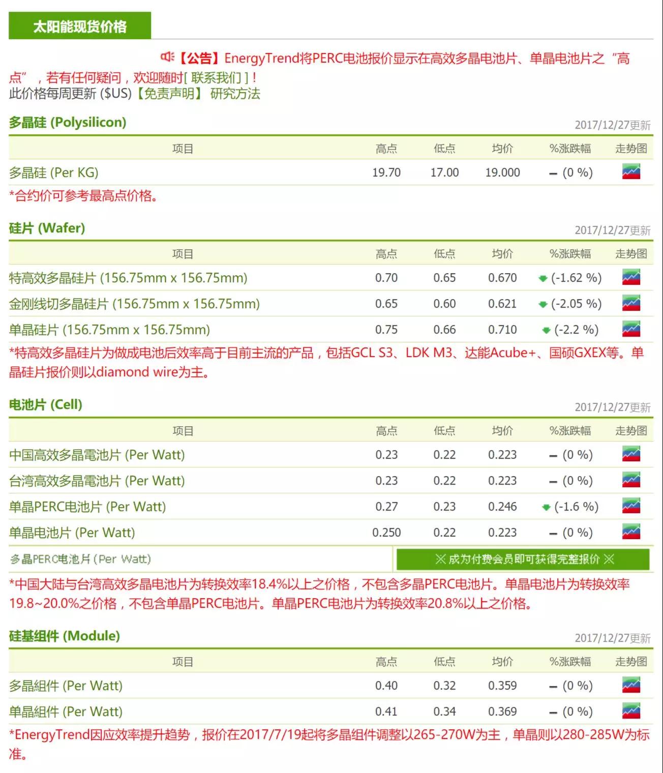 雖然單晶產(chǎn)品的需求開始有了起色,但為了在明年第一季拉高單晶產(chǎn)品的競爭力,單晶硅片的龍頭廠主動調(diào)降單晶硅片價格RMB 0.2/pc至RMB 5.3-5.4/pc,美元價格則為USD 0.71-0.72/pc,帶動其他單晶硅片廠也調(diào)低報價。然而,由于之前單晶市況不佳,市場成交價與報價原就有脫勾,因此本次價格調(diào)降實際影響低于RMB 0.12/pc。