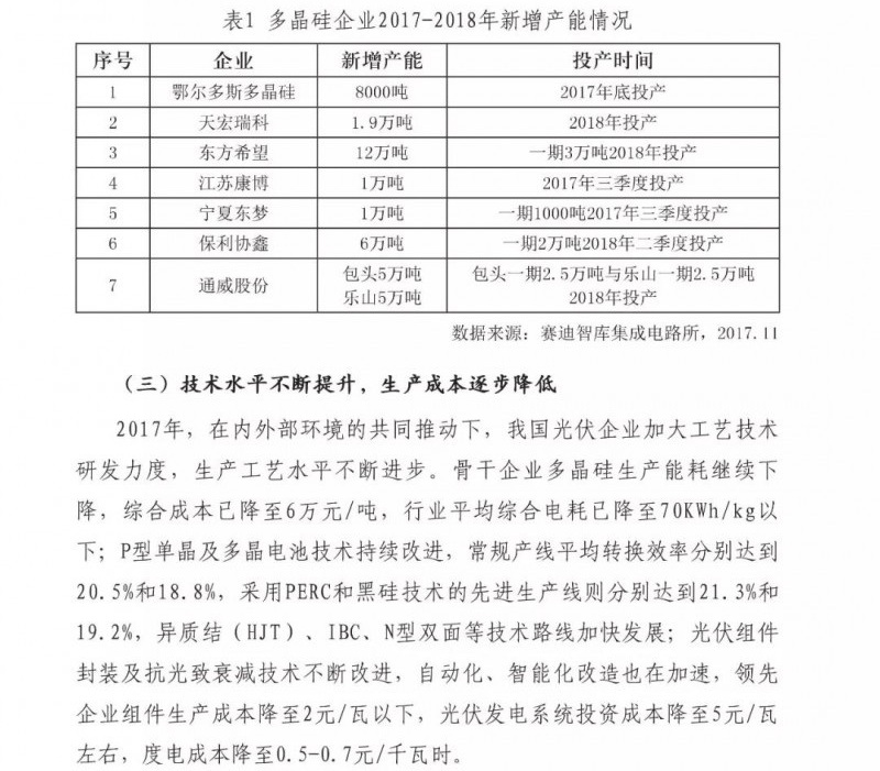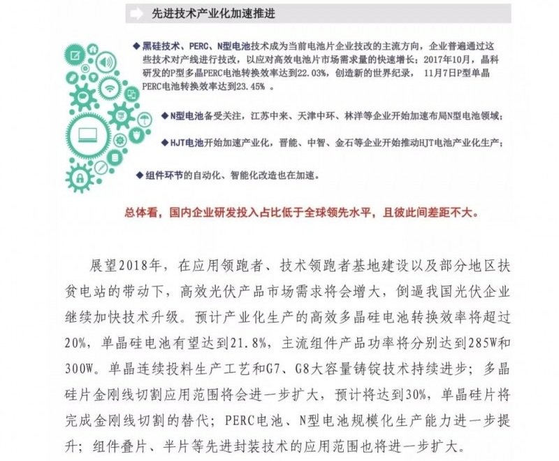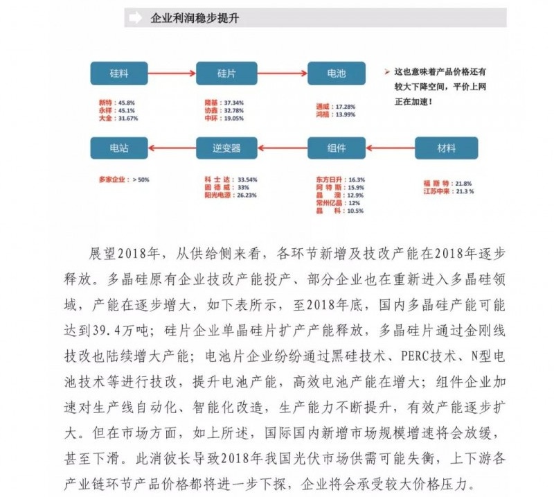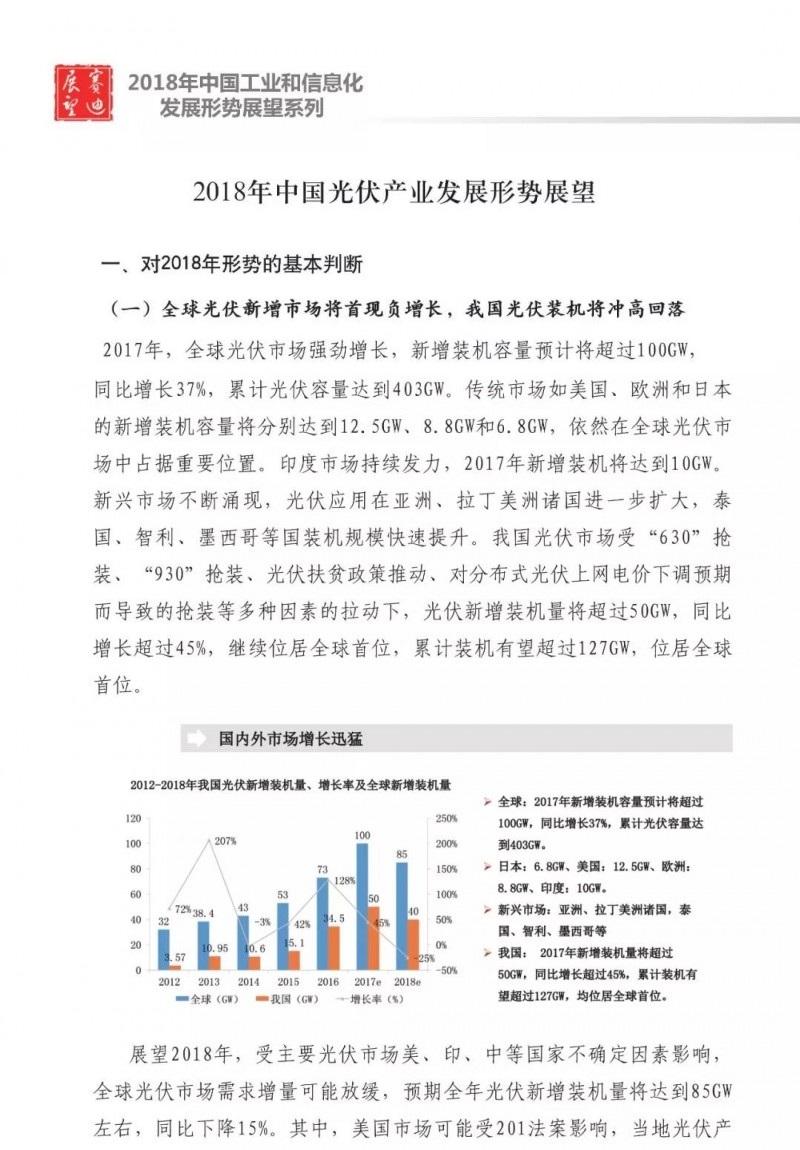 中國儲能網(wǎng)訊:近日,賽迪智庫發(fā)布了2018年中國光伏市場預測報告。重點如下:1、2018年全球光伏需求增量放緩,新增裝機量將達到85GW左右,同比下降15%;2、2018年我國光伏市場供需可能失衡,上下游各產(chǎn)業(yè)鏈環(huán)節(jié)產(chǎn)品價格都將進一步下探,企業(yè)將會承受較大價格壓力;3、高效光伏產(chǎn)品市場需求將會增大,倒逼我國光伏企業(yè)繼續(xù)加快技術升級。4、光伏市場規(guī)??焖贁U大和可再生能源附加征收不足,補貼資金缺口越來越大。