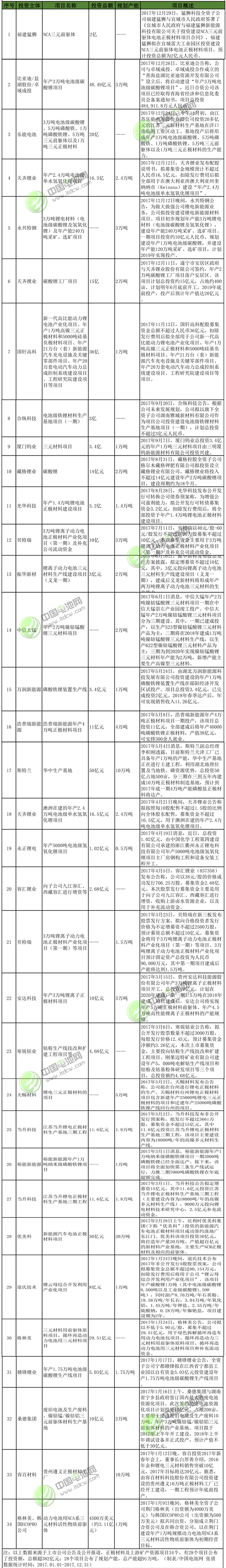 2017年1月-2017年12月正極材料及上游礦產(chǎn)資源項(xiàng)目投資情況統(tǒng)計(jì)表