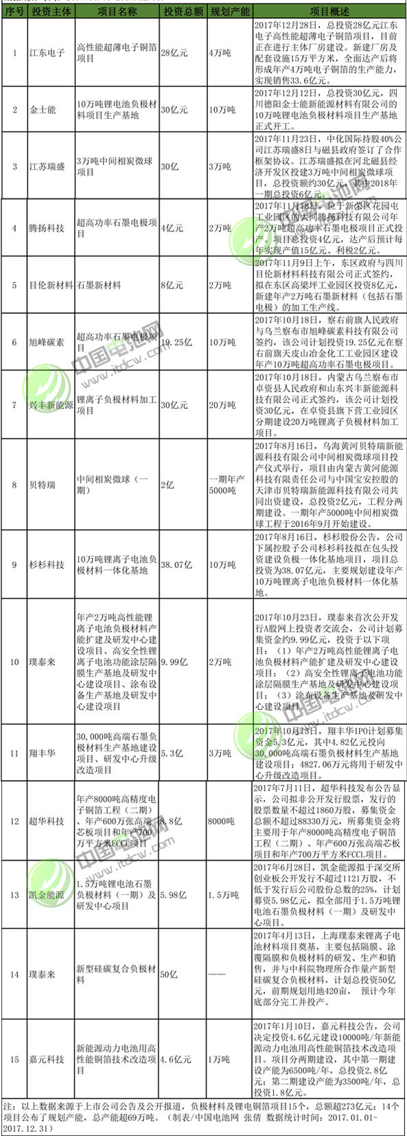 2017年1月-2017年12月負(fù)極材料及鋰電銅箔項(xiàng)目投資情況統(tǒng)計(jì)表