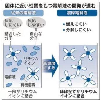 東京大學(xué)的山田淳夫教授等人在2014 年使用高濃度電解液,將電池的充電時間降到通常鋰離子電池的1/3已取得了成功。山田教授說:“在以往的常識中如果達到高濃度的話,電池反應(yīng)速度會變慢,高濃度電解液被認為不適合于鋰離子電池。