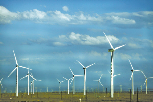 電力交易的開展,促進了華北、西北電能在華中消納。圖為位于甘肅嘉峪關戈壁灘上的一處風電場。孫耀賢 攝