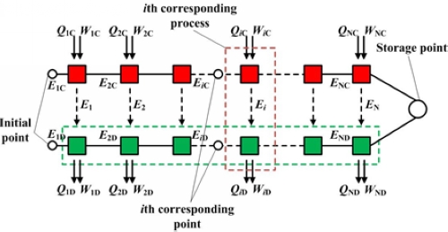 通過對物理儲能系統(tǒng)流程的分析發(fā)現(xiàn)其具有較強的對應性,如抽水蓄能系統(tǒng)水位上升與水位下降過程,蓄熱系統(tǒng)的儲能和釋熱過程,壓縮空氣儲能系統(tǒng)的空氣壓縮和膨脹過程,以及飛輪儲能系統(tǒng)飛輪加速和減速過程;同時不僅流程對稱,系統(tǒng)參數(shù)也存在很強的對應性。因此,基于物理儲能系統(tǒng)流程的對應性特點,中國科學院工程熱物理研究所儲能研發(fā)中心以流程復雜的壓縮空氣儲能系統(tǒng)為例,創(chuàng)新性的提出適用于對應點分析優(yōu)化算法(CPM),并將該方法推廣至物理儲能系統(tǒng)。
