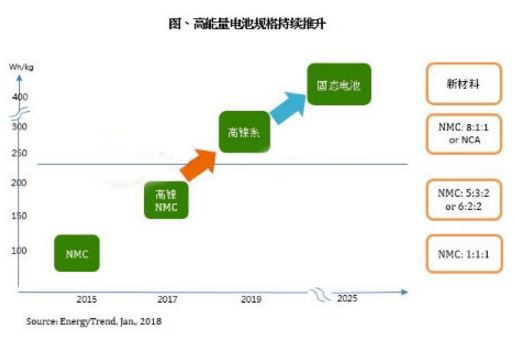 為解決成本上漲問題,動力電池往高能量密度(>200Wh/kg)產品推進。電池芯廠積極導入鎳錳鈷(NMC)與鎳鈷鋁(NCA)等正極材料,增加鎳金屬的使用量,鈷金屬的比重將逐漸降低。EnergyTrend研究顯示,目前日韓電池廠的主流產品中,鎳、錳、鈷的配比大多為6:2:2,預估2018年的配比主流將轉為8:1:1,而中國電池廠的材料配比也將逐漸從5:3:2提升至6:2:2。呂理舜指出,鈷金屬使用量的降低,將改善鈷金屬短缺的情況。