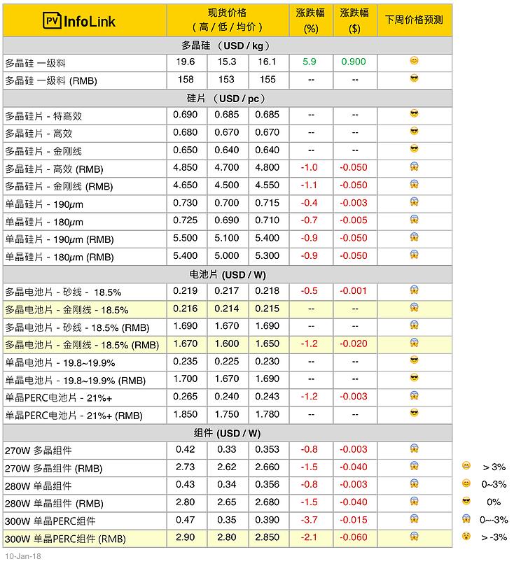 減少的國(guó)內(nèi)需求讓單,多晶組件價(jià)格都繼續(xù)下探,國(guó)內(nèi)常規(guī)組件價(jià)格普遍跌至每瓦2.65 - 2.68元人民幣之間,且跌勢(shì)持續(xù)中。由于二,三月會(huì)是今年上半年中需求最淡的時(shí)間點(diǎn),目前看來(lái)廠(chǎng)商的年前備貨力道并不會(huì)太強(qiáng)勁。