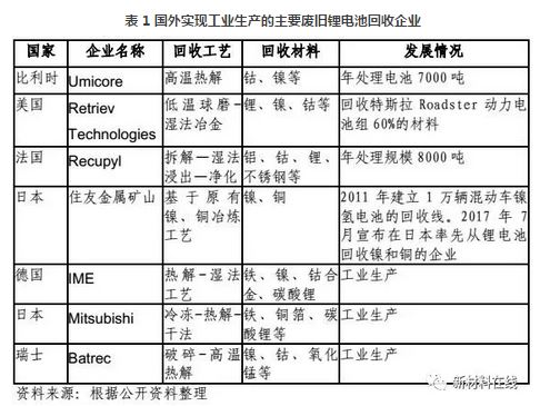 此前,歐美和日本的消費電池、家電電子等回收利用(主要方式是再生利用)取得了良性的發(fā)展,為動力電池的再生利用打下了良好基礎。從動力再生利用的實施主體上看,大多為專業(yè)的金屬冶煉回收企業(yè)或材料企業(yè)轉型而來。比利時優(yōu)美科、美國 Retriev Technologies、法國 Recupyl、日本住友金屬礦山等是全球較為知名的鋰電池再生企業(yè)。