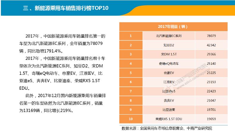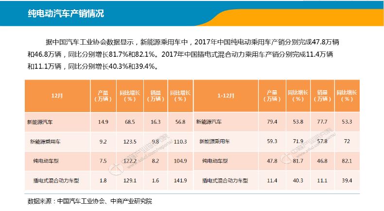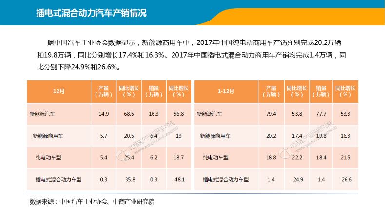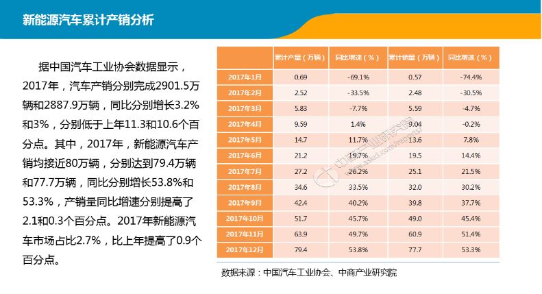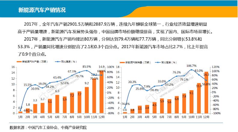 其中,2017年新能源汽車產(chǎn)銷均接近80萬輛,分別達(dá)到79.4萬輛和77.7萬輛,同比分別增長(zhǎng)53.8%和53.3%,產(chǎn)銷量同比增速分別提高了2.1和0.3個(gè)百分點(diǎn)。2017年新能源汽車市場(chǎng)占比2.7%,比上年提高了0.9個(gè)百分點(diǎn)。