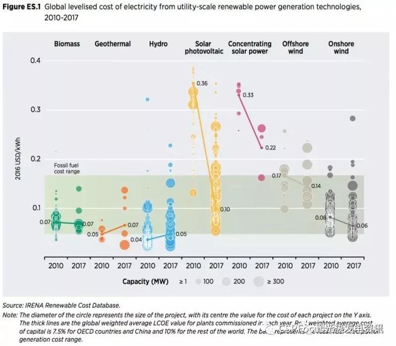 ? 光熱發(fā)電:2017年LCOE為0.22美元/千瓦時(shí),比2010年(0.33美元/千瓦時(shí))下降33%