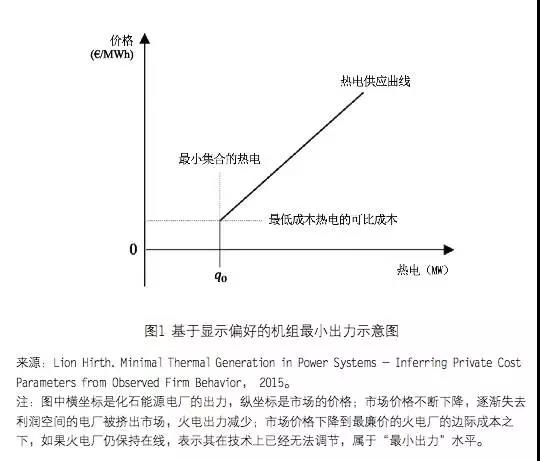 ? 向下的調(diào)峰涉及最小出力問題, 這方面的討論仍舊是非常不透明的。如果系統(tǒng)所有的機(jī)組都實(shí)現(xiàn)了最小出力,那么 證明系統(tǒng)存在嚴(yán)重的供大于求,價(jià)格需要大幅跌落,以將盡可能多的出力擠出。電 價(jià)不斷下降到低于燃料成本的程度(比如 0.1 元 / 千瓦時(shí)—0.15 元 / 千瓦時(shí)),靈活 的煤電就寧愿盡可能地停機(jī),而不愿意留在序列里承擔(dān)虧錢的損失了。那么剩下的, 就是的確“往下調(diào)不了”或者不足夠靈活參與下一階段市場(chǎng)的那部分。這種基于“顯 示偏好”的最小出力,往往比測(cè)算出的技術(shù)性最小出力要準(zhǔn)確得多(見圖1)。