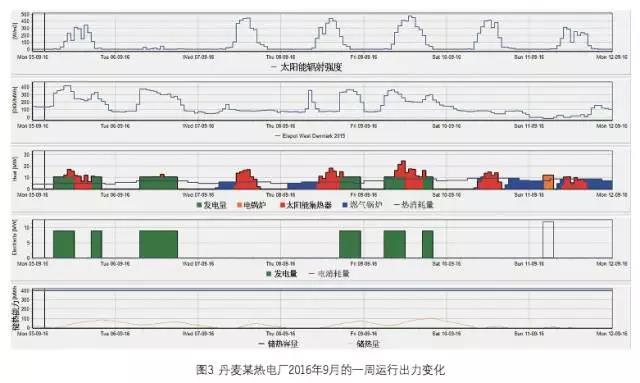 注:從上到下依次是太陽(yáng)能熱水器的出力、電力市場(chǎng)價(jià)格、熱生產(chǎn)與消費(fèi)、電力生產(chǎn)與消費(fèi),以及儲(chǔ)熱罐的儲(chǔ)熱容量變化。這一電廠將在電價(jià)高的時(shí)候發(fā) 電,余熱儲(chǔ)存;電價(jià)極低的時(shí)候用電生熱并儲(chǔ)熱。逐小時(shí)地變化。來(lái)源:EMD International A/S網(wǎng)站。