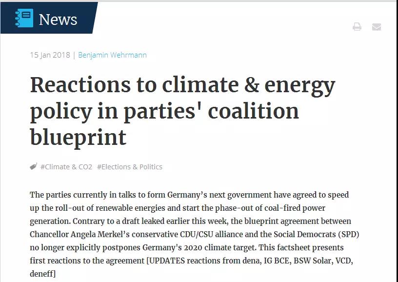 目前正在就籌備德國下屆政府進(jìn)行組閣談判的各方已同意加快可再生能源的推廣,并開始逐步淘汰燃煤發(fā)電。德國總理默克爾領(lǐng)導(dǎo)的保守的基督教民主聯(lián)盟聯(lián)盟和社會(huì)民主黨之間的藍(lán)圖協(xié)議已明確,不再推遲德國2020年的氣候目標(biāo)。