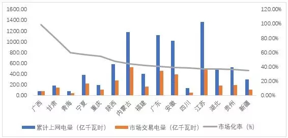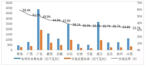 分省來看,全國市場交易電量規(guī)模排序前三名的省份分別為廣東省1940億千瓦時(含西電東送省間協(xié)議電量)、江蘇省1160億千瓦時和山東省970億千瓦時。外受電市場交易電量排序前三名的省份分別是廣東省1332億千瓦時(含西電東送省間協(xié)議電量)、浙江省363億千瓦時和山東省286億千瓦時。全國銷售電量市場化率排序前三名的省份是青海、廣西、廣東,分別為59.4%、52.0%、49.9%。