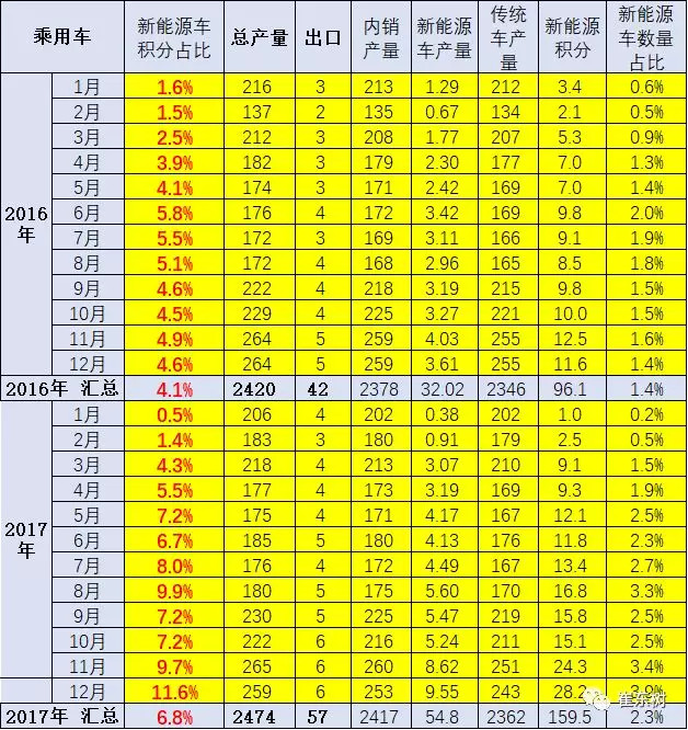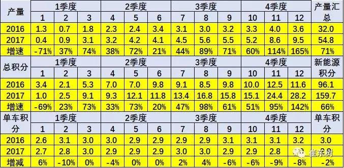 12月的新能源車生產(chǎn)9.5萬臺,形成新能源積分28.2萬分,每臺乘用車平均3分,較16年12月的3.21分下降89%。17年1-12月新能源乘用車產(chǎn)量54.8萬臺,較2016年增長71%,而新能源積分達到160萬分,較16年同期增長66%。