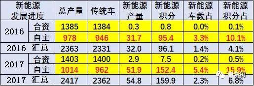 2017年1-12月的新能源車銷量占比2.3%,較2016年全年的1.4%有了大幅改善提升。其中合資企業(yè)的改善較小,2017年產(chǎn)量2.9萬臺,相對自主的52萬臺,差距很大。