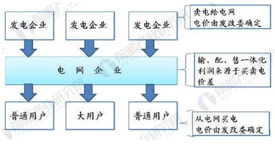 據(jù)前瞻產(chǎn)業(yè)研究院《2018-2023年中國新電改發(fā)展模式與投資戰(zhàn)略規(guī)劃分析報告》分析,現(xiàn)行的電力產(chǎn)業(yè)結(jié)構(gòu)中,主要特征是“管住兩頭,中間不管”,賣電給電網(wǎng),電價由發(fā)改委確定,輸配售三方一體化,利潤來源于買賣電價差,用戶用電只能通過電網(wǎng)買電,電價由發(fā)改委確定。