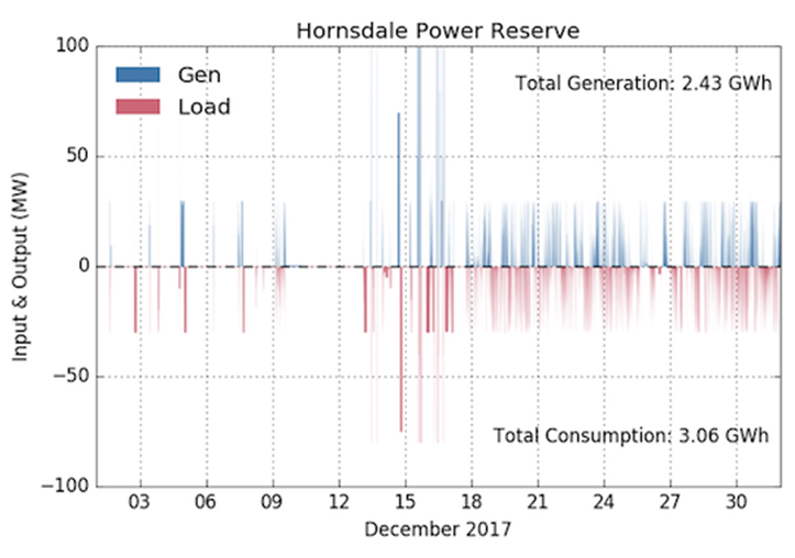 霍恩斯代爾電池儲系統(tǒng)在2017年12月產(chǎn)生了2.42吉瓦時的能源,消耗了3.06吉瓦時的電能。