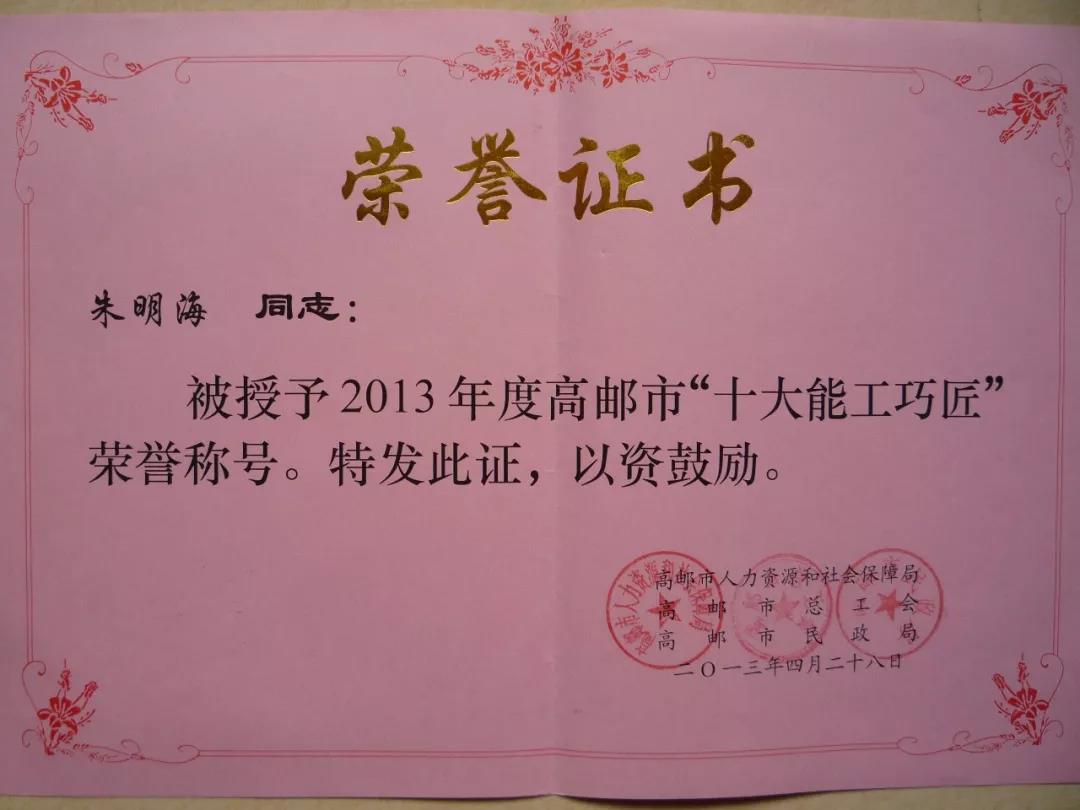 近年來,朱明海先后獲得高級工程師、高級經(jīng)濟師職稱;揚州市五一勞動獎?wù)隆P州英才培育對象、高郵市十大能工巧匠等榮譽稱號。