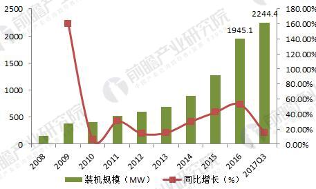 圖表2:2008-2017年全球電化學(xué)儲能項目累計裝機規(guī)模(單位:MW,%)